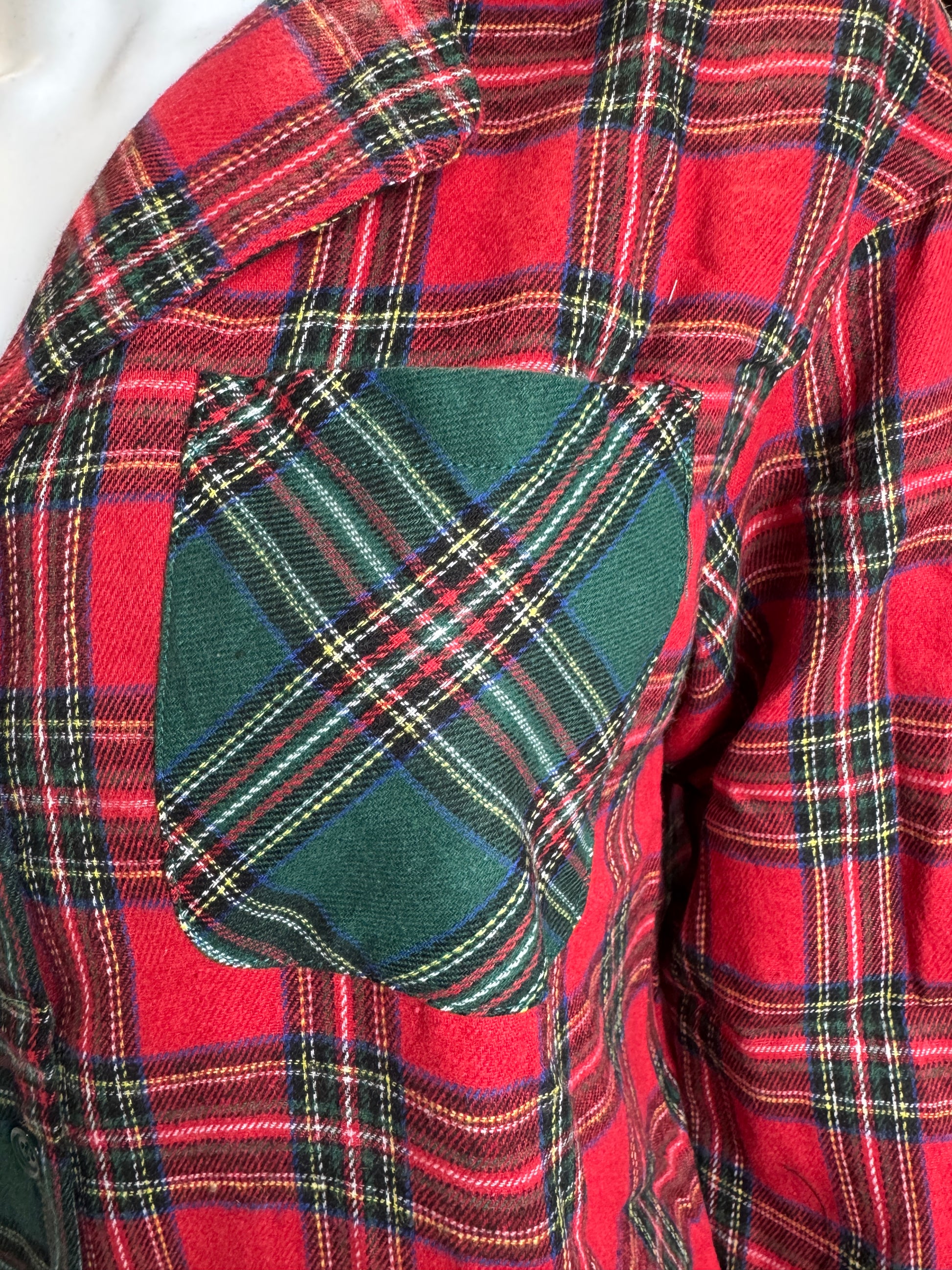 Classic plaid with contrast patchwork. Soft, breathable fabric.